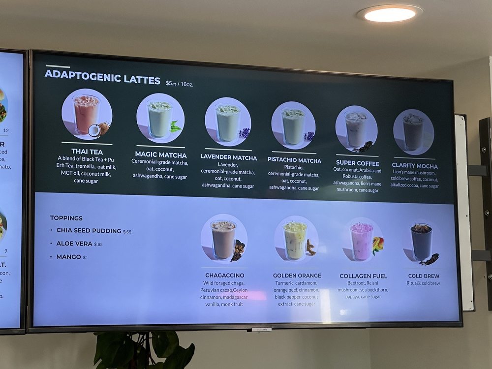 Ceremonialgrade matcha, oat milk, coconut milk, spirulina, MCT oil, mint, and comes with your choice of milk.
