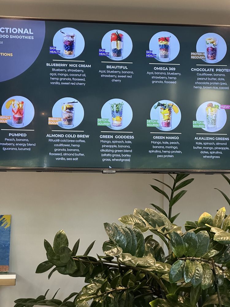 Base banana, peanut butter, chocolate plantprotein, coconut chia seed pudding. Toppings hemp granola, blueberry, mango, flaxseed, sliced almond. Drizzle upon request.