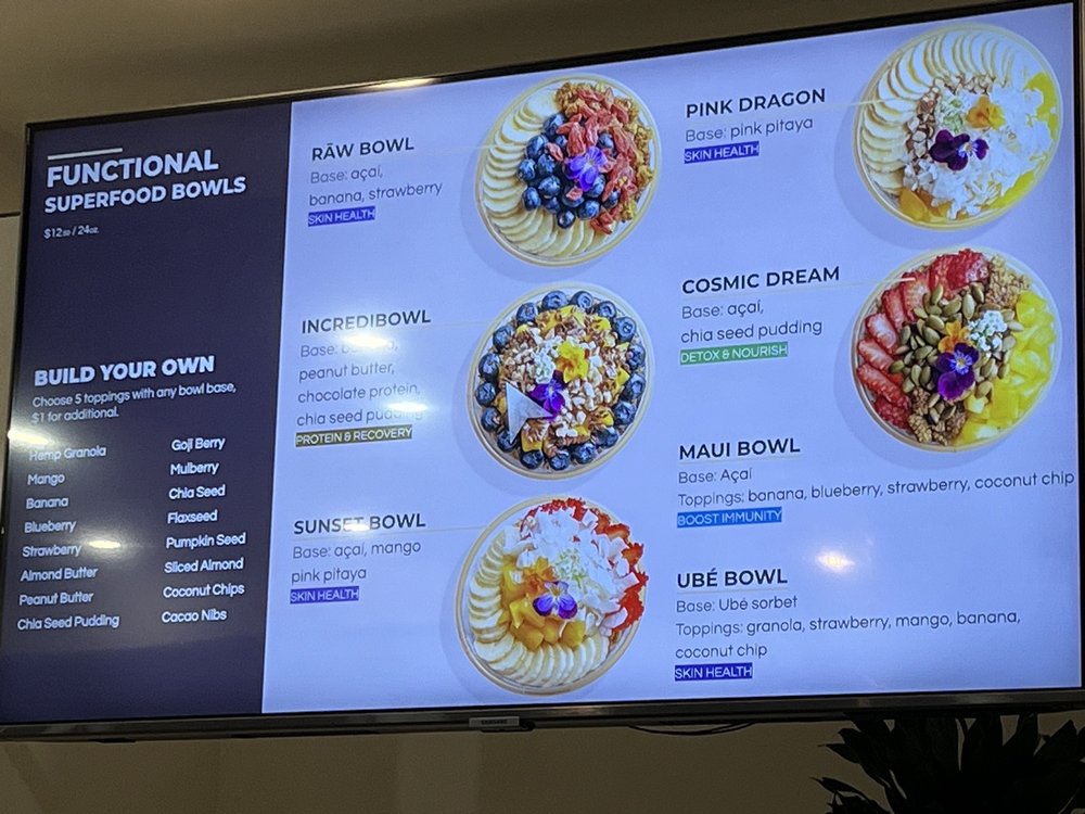 Base Acai Ube Matcha Toppings Hemp Hearts Granola, Banana, Blueberries, Strawberries, Coconut Chips.