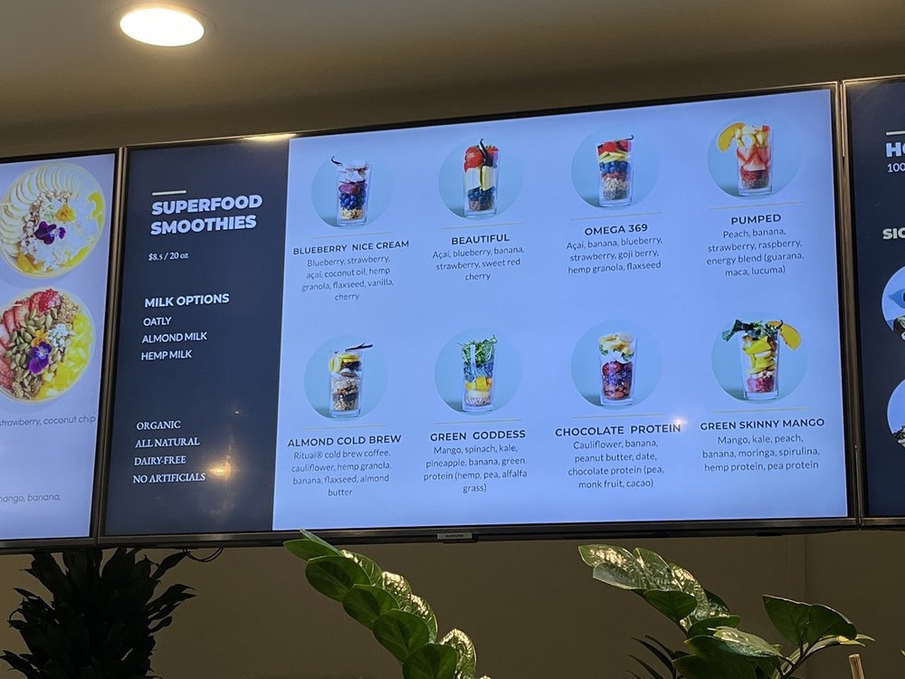 Base Blue Spirulina Mango Coconut Toppings Hemp Hearts Granola, Banana, Blueberries, Almonds, Pumpkin Seeds.