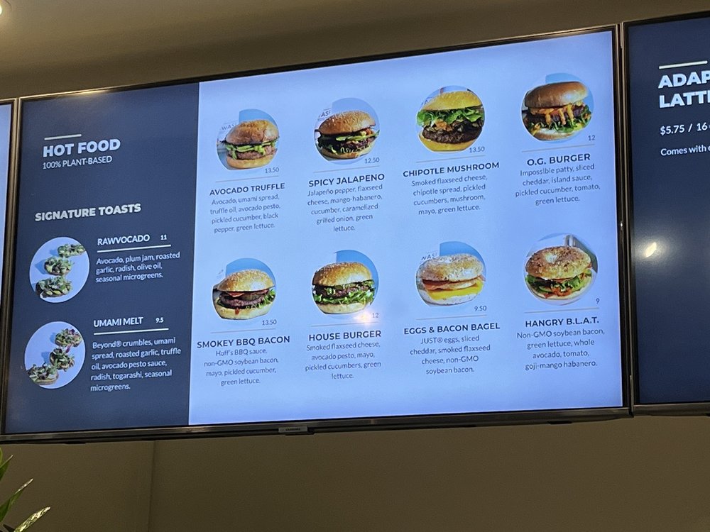 Impossible patty, JUST eggs, sliced cheddar, smoked flaxseed cheese, served on an everything bagel.